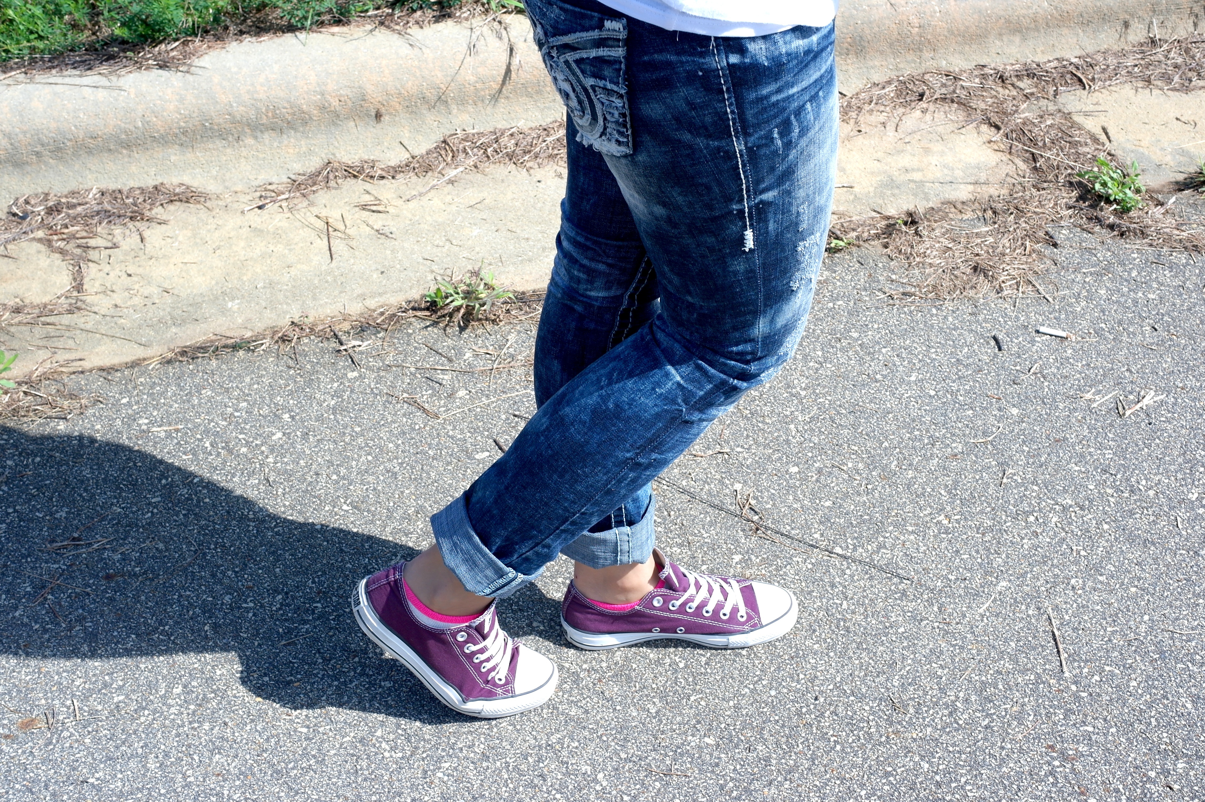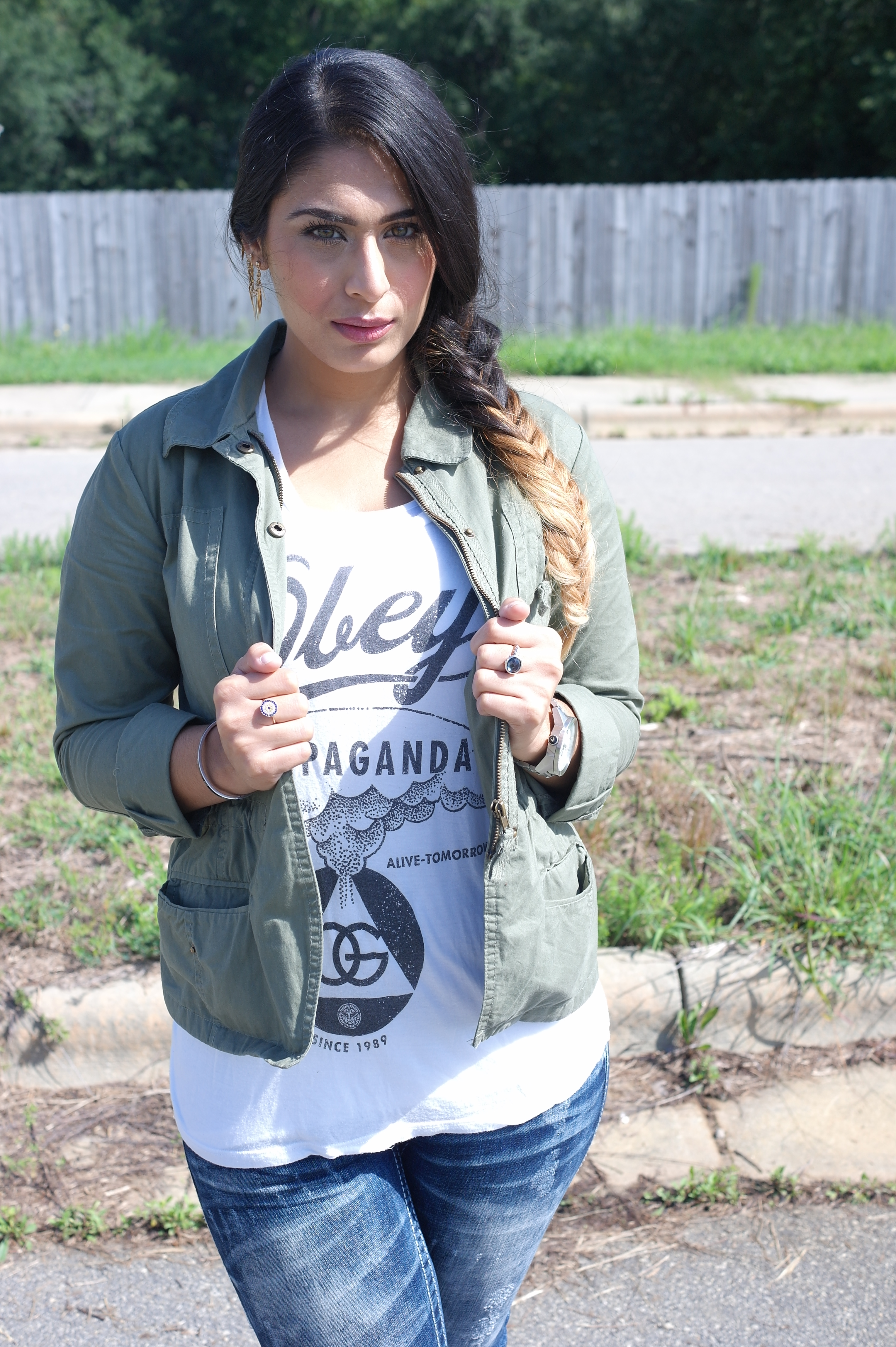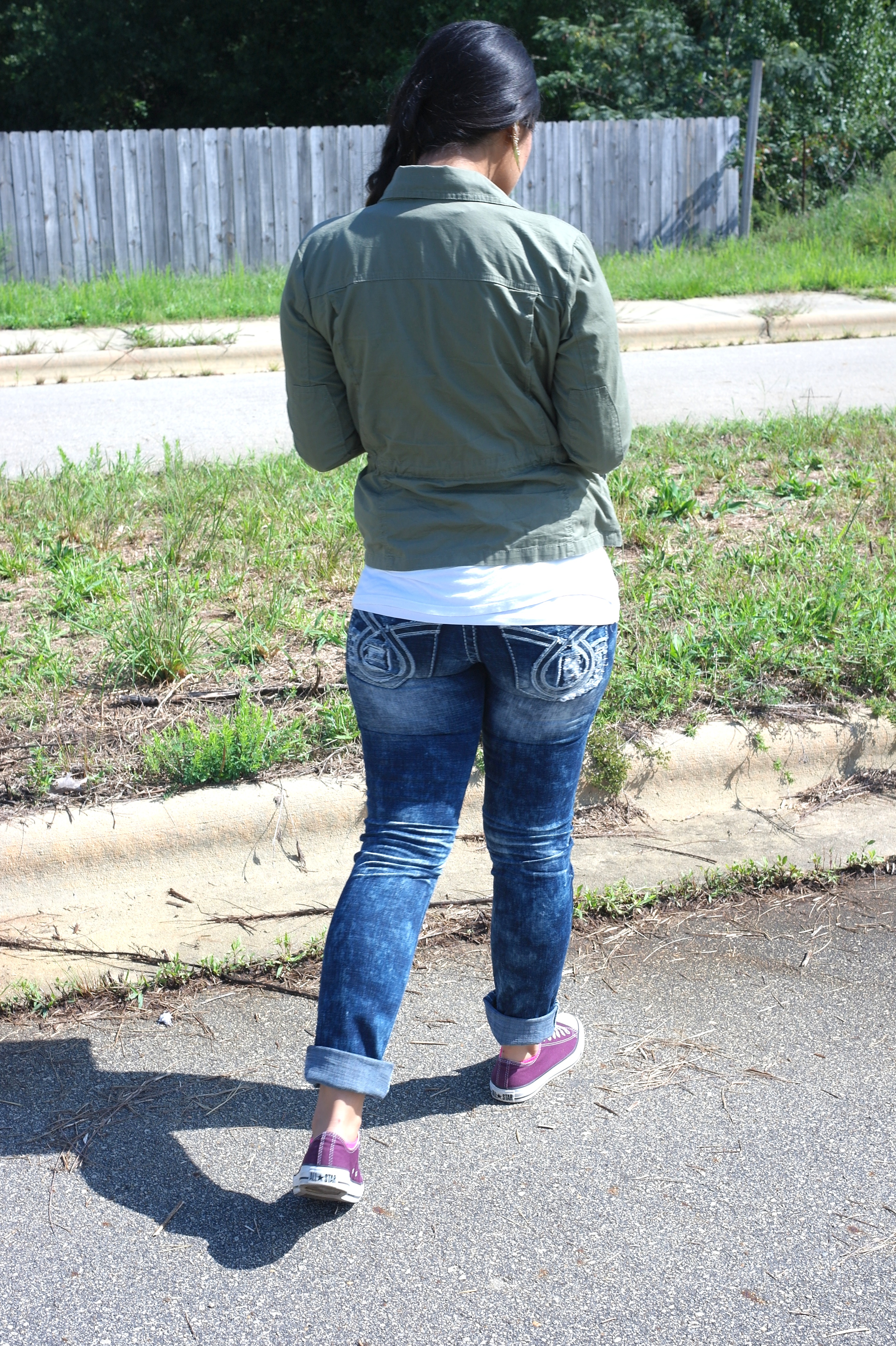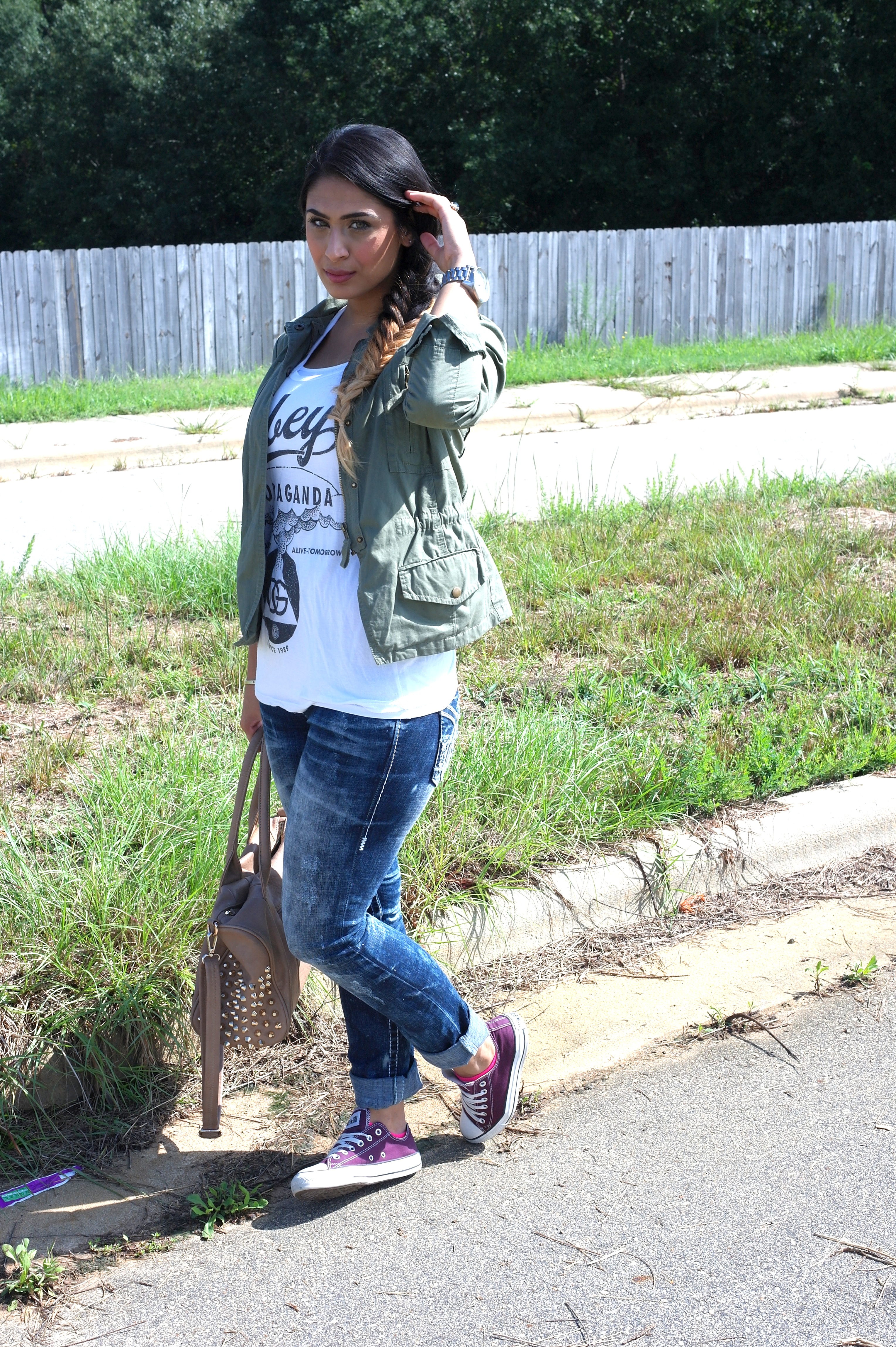 This post, I’m sticking to my roots, as much as I love dressing up, it isn’t my everyday look. I wore heels this past weekend and I NEVER wear heels, unless someone is getting married. I don’t know how girls function in heels, I’m definitely jealous at times but I just naturally gravitate to flats. I paired my straight acid wash jeans with a white t-shirt and threw a jacket over it, and kept it even more “Fatima” with my purple converses and a fishtail braid.